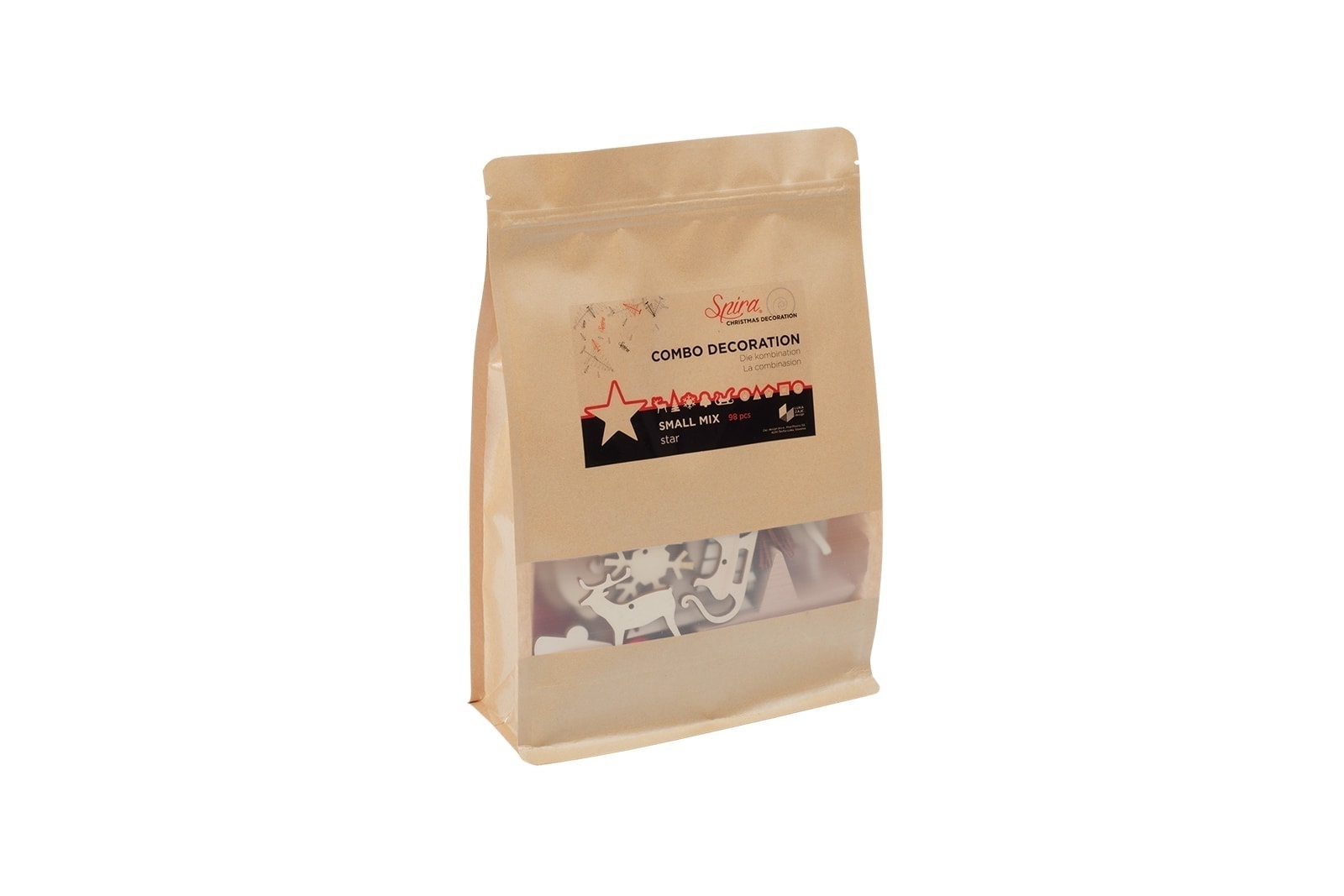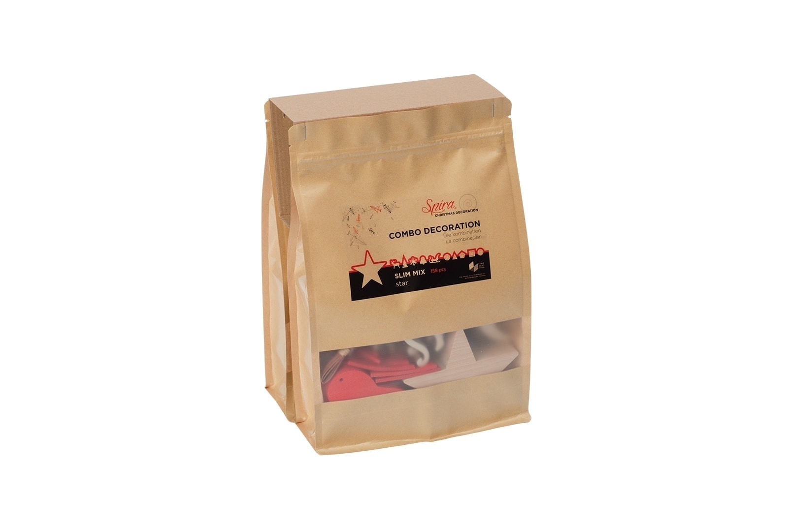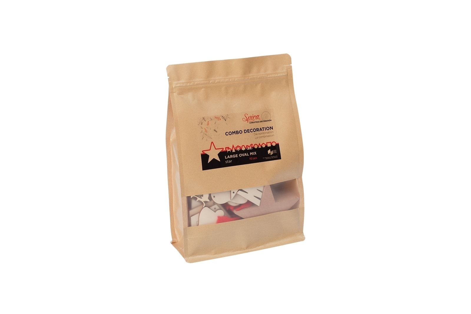 Komplettpaket mit einem Mix aus hölzernen Weihnachtsbaumhängern, Filz-Weihnachtsanhängern und einer Weihnachtsbaumspitze. Dieses Weihnachtsdekorationspaket wurde speziell für den hölzernen Spiral-Weihnachtsbaum der Marke Spira zusammengestellt.