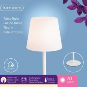Die Lampe ist mit einem integrierten, wiederaufladbaren Akku ausgestattet und ist IP-44 zertifiziert, was bedeutet, dass sie für den Außenbereich geeignet und beständig gegen Spritzwasser ist. Die neutrale weiße Farbe macht die Lampe für jede Art von Gartenmöbeln geeignet.